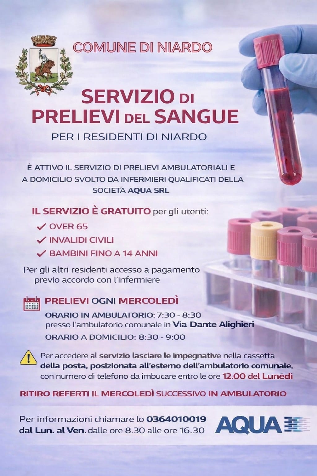Tutti i mercoledì in ambulatorio dalle 7.30 alle 8.30 e a domicilio dalle 8.30 alle 9.00.